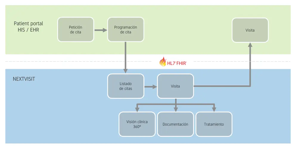 NextVisit es nuestra solución de telemedicina basada en la interacción del profesional y el paciente a través de vídeo. Tiene su origen en la necesidad de nuestros clientes de limitar la presencialidad de las consultas médicas a casos urgentes derivada de las restricciones de movilidad impuestas por la reciente pandemia COVID-19. NextVisit ha demostrado ser un recurso imprescindible para los profesionales de la salud y los pacientes destinada a dar continuidad a las primeras consultas, a las consultas de seguimiento, así como para la comunicación de resultados de pruebas diagnósticas. Nexty, chatbot creado con la tecnología más reciente, interactúa con el paciente mediante un diálogo interactivo a través de preguntas y respuestas filtradas en función de la especialidad de la visita. El mayor valor de nuestra solución de telemedicina es su integración completa en la propia historia clínica electrónica, sin obstaculizar la consulta de información por parte del profesional asistencial.